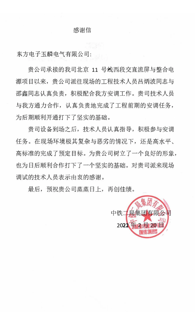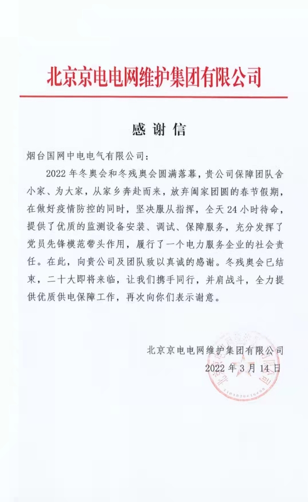 北京京电电网维护集团有限公司致感谢信