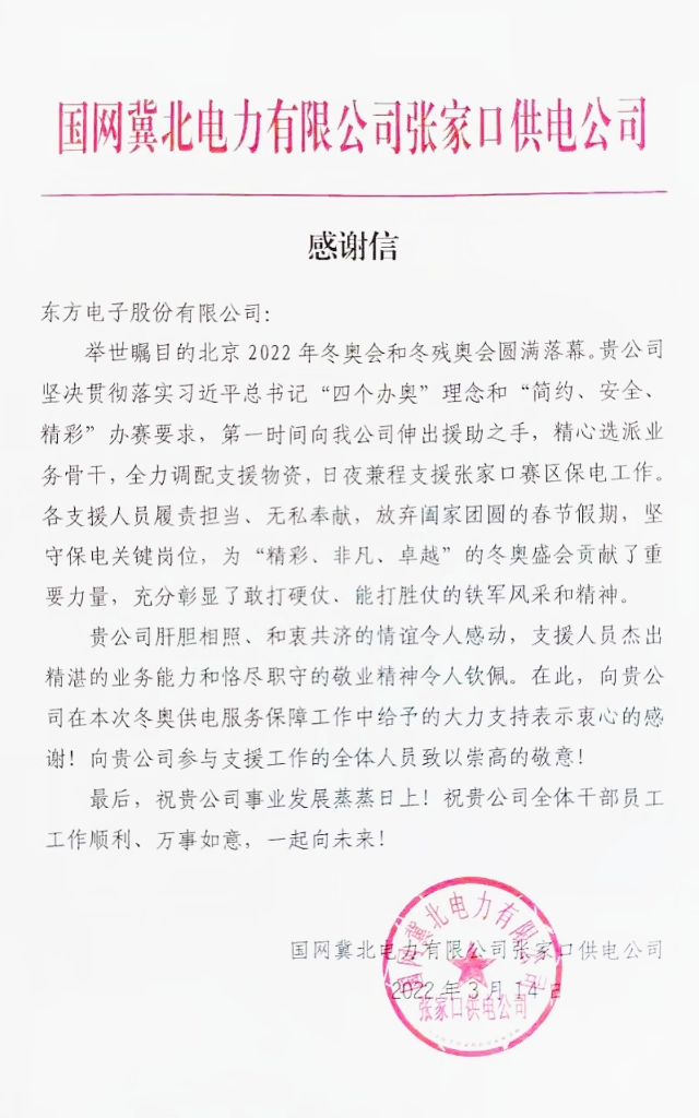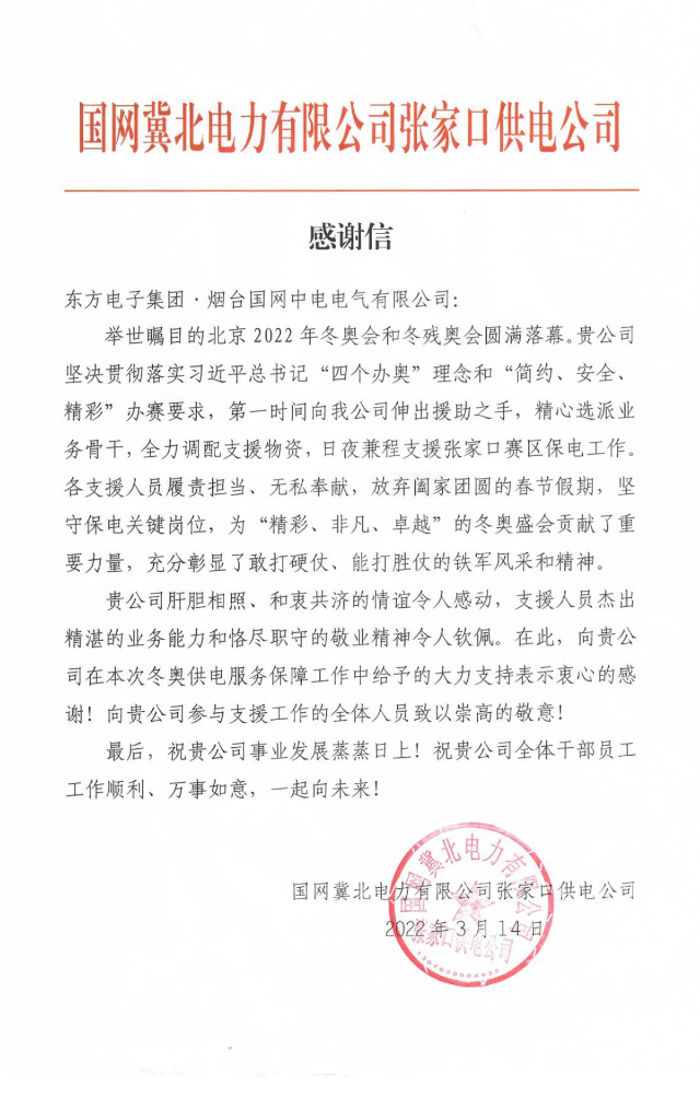国网冀北电力有限公司张家口供电公司致感谢信