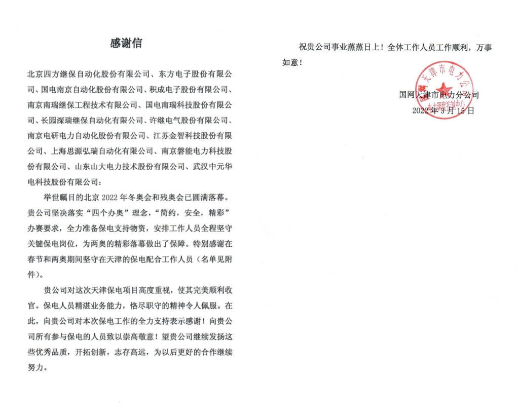 国家电网天津市电力分公司致感谢信