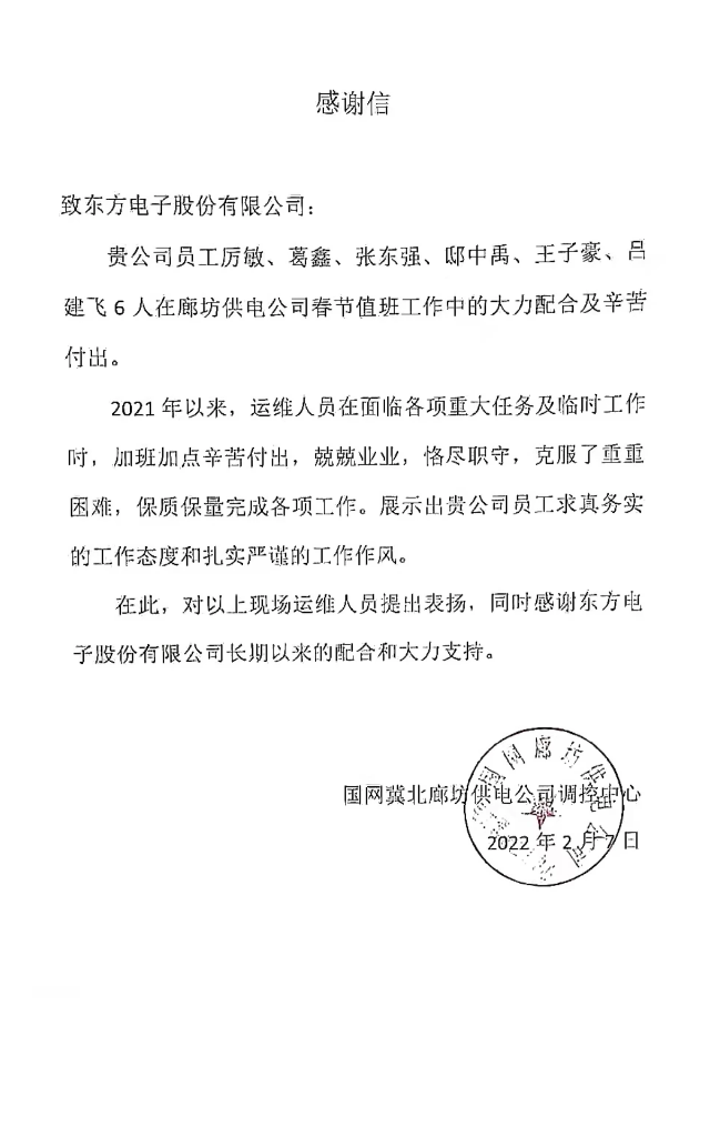 国家电网冀北廊坊供电公司致感谢信
