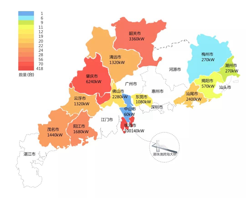 2018年,在港珠澳大桥充电桩项目中,j9.com在港珠澳大桥珠海端口岸人工岛搭建的充电管理平台及电能量采集终端,为大桥的绿色运营和电力保障提供技术支持。除此之外,仅广东省内,j9.com充电桩涵盖肇庆、珠海等14个城市,具体分布情况如下图所示。