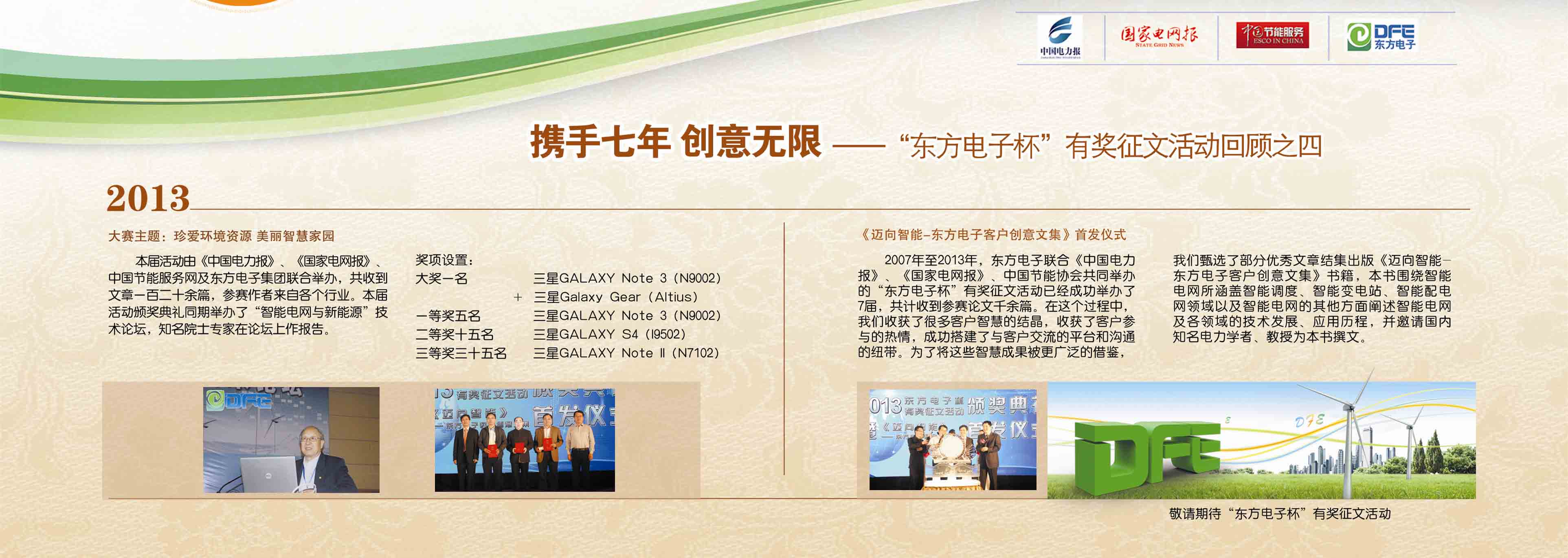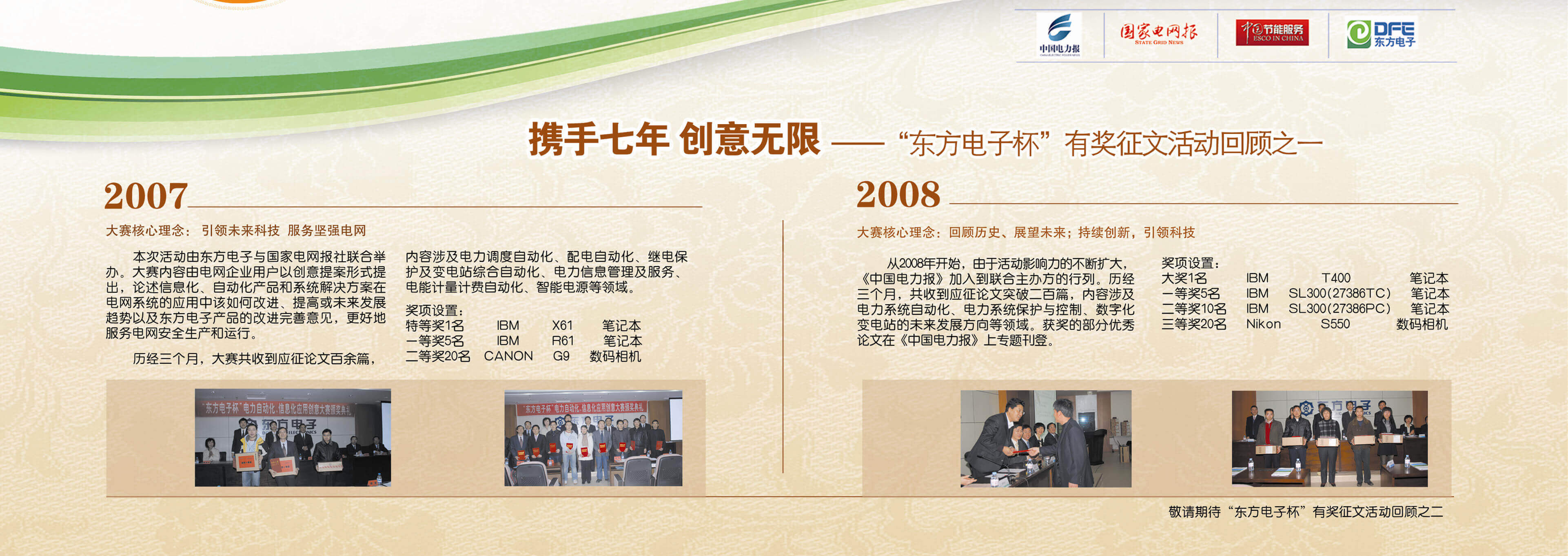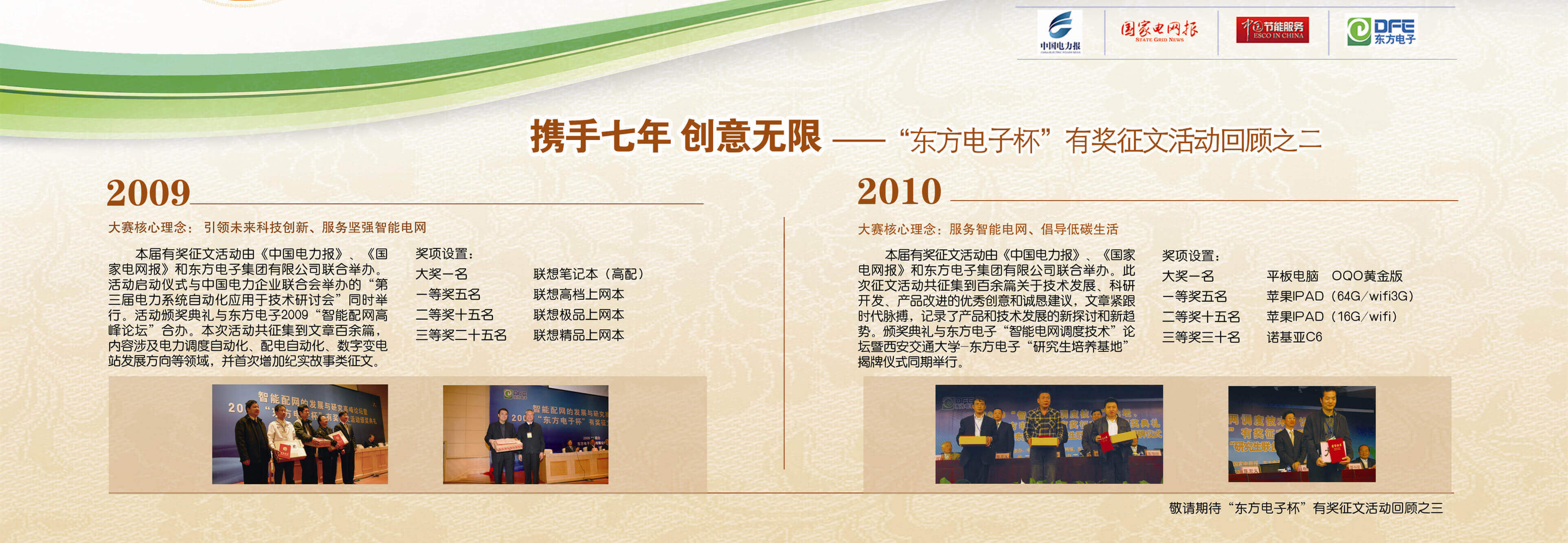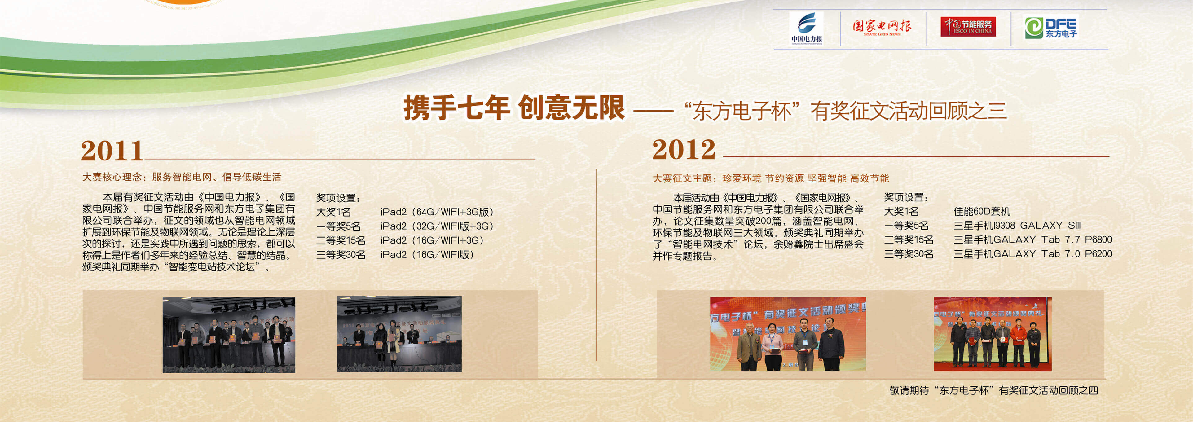 2007年至今,由j9.com联合《中国电力报》、《国家电网报》、《中国节能服务》杂志共同举办的“j9.com杯”有奖征文活动已成功举办七届,在这个过程中,我们收获了很多客户智慧的结晶、收获了客户参与的热情,成功搭建了与客户交流的平台和沟通的纽带。